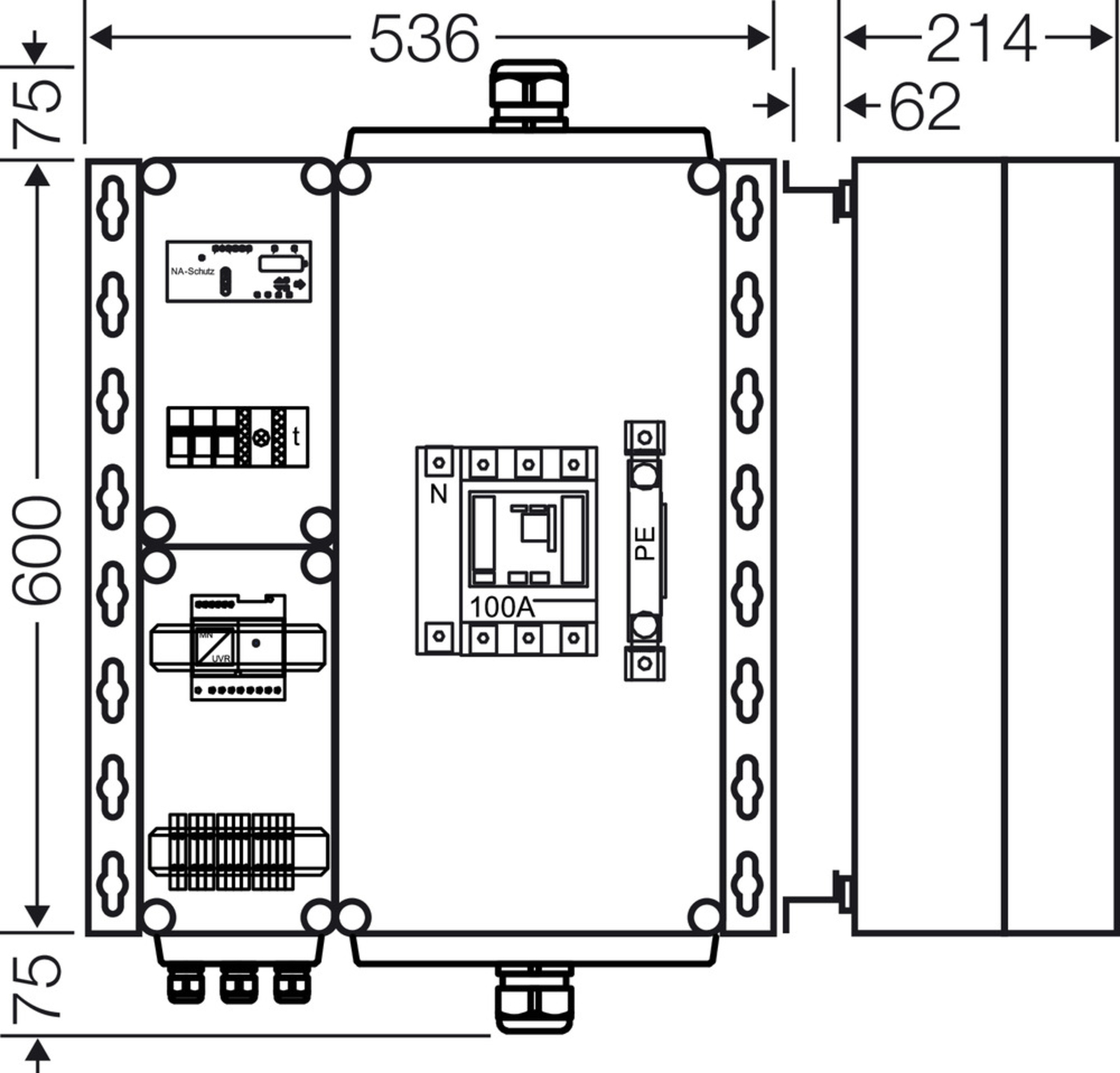 Freischaltstelle 63 kW/70 kVA mit NA-Schutz und einem Leistungsschalter, 4-polig, als Schalteinrichtung. Freischaltstelle vorbereitet für die Integration des vereinfachten Einspeisemanagements. Schutzart: IP 65 nach IEC 60529. Abmessungen HxBxT 750 x 536 x 276 mm