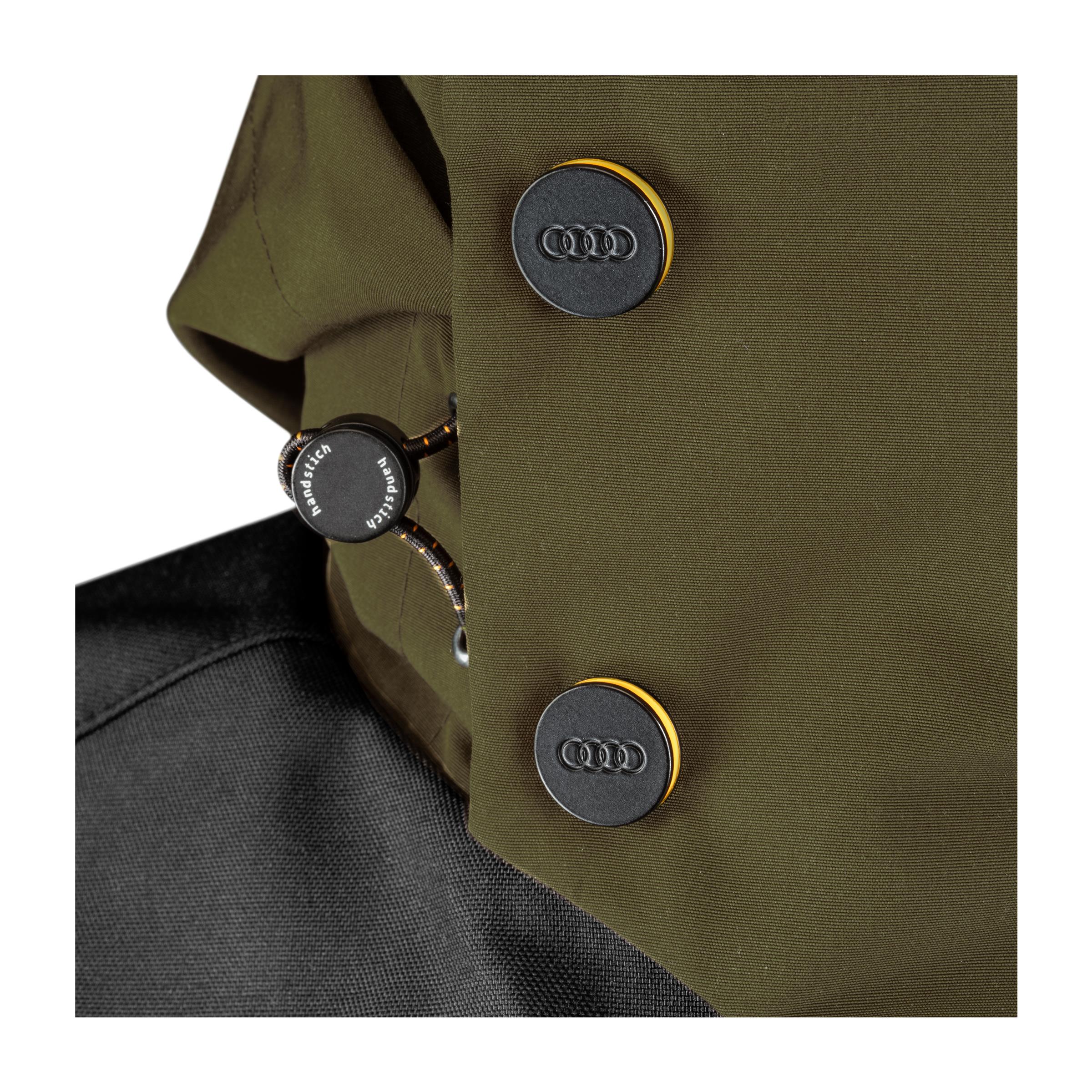 - Branding: Audi Ringe Logo Druck dezent an Weste und Kapuze, Druckknöpfen, Reißverschluss-Puller, Story label im Nacken, Webetikett intern an Brusttasche