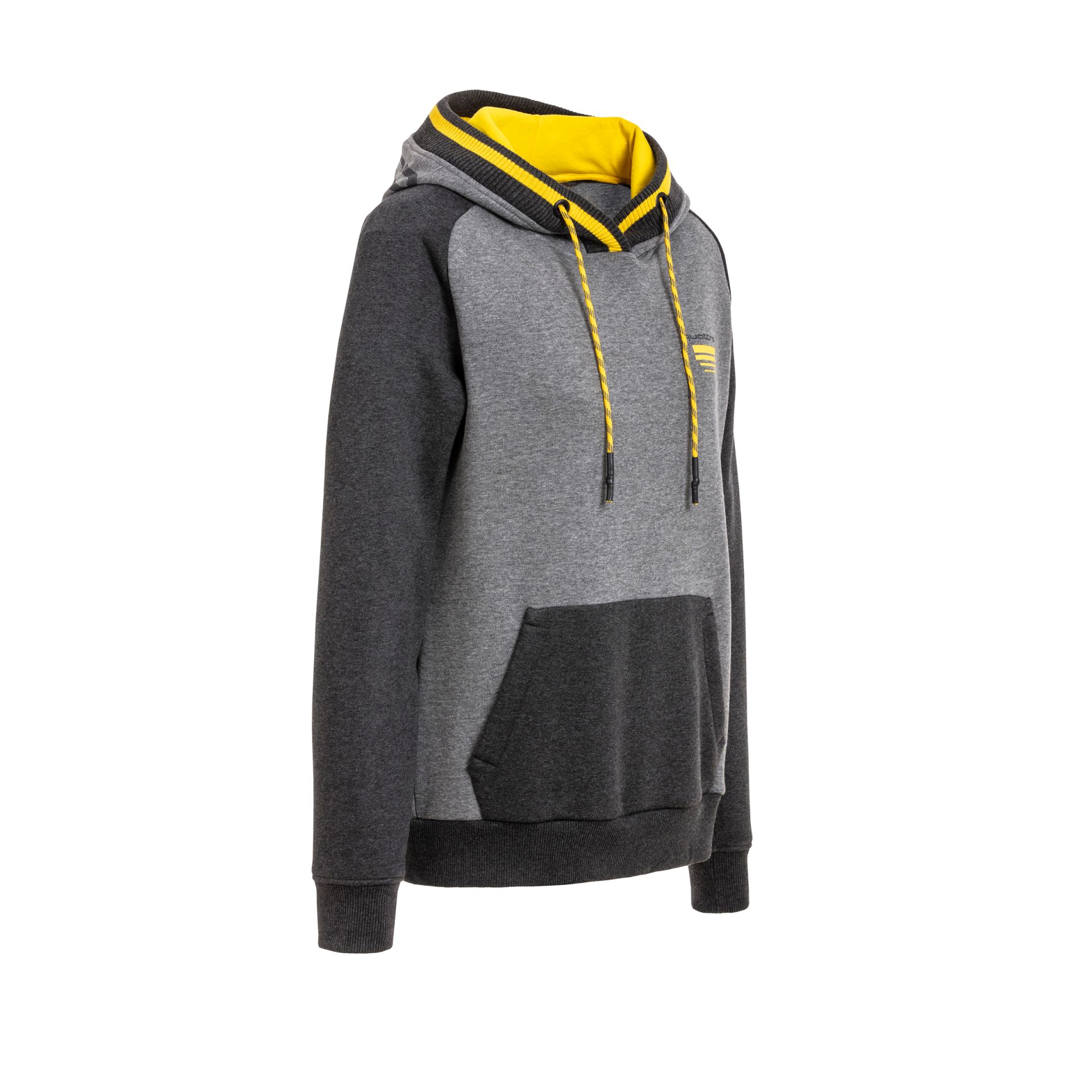 - Gefütterte Kapuze innen in Kontrastfarbe Gelb und mit Rippbündchen in Gelb und Grau