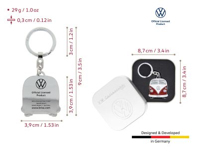 Der coole Bulli Schlüsselanhänger besteht aus einer vernickelten Zink-Aluminium-Legierung und ist mit einer farbigen Emaille überzogen. Dank dieser Art der Fertigung bleiben bei starker Belastung die Farben präzise und lange brillant. Das macht den kultigen Schlüsselring zu dem perfekten Gadget! Bringen Sie den Retro-Style in Ihren Alltag!