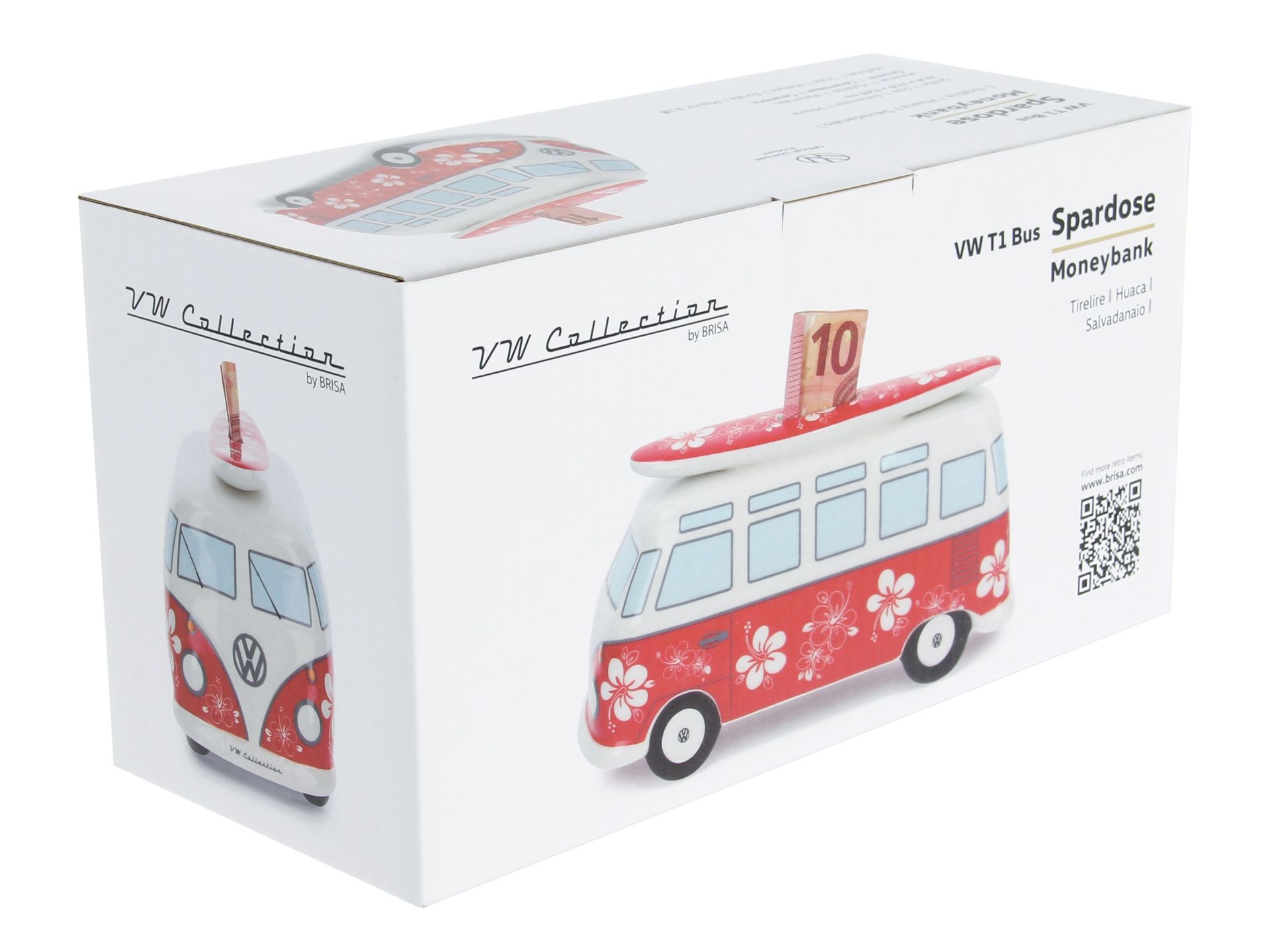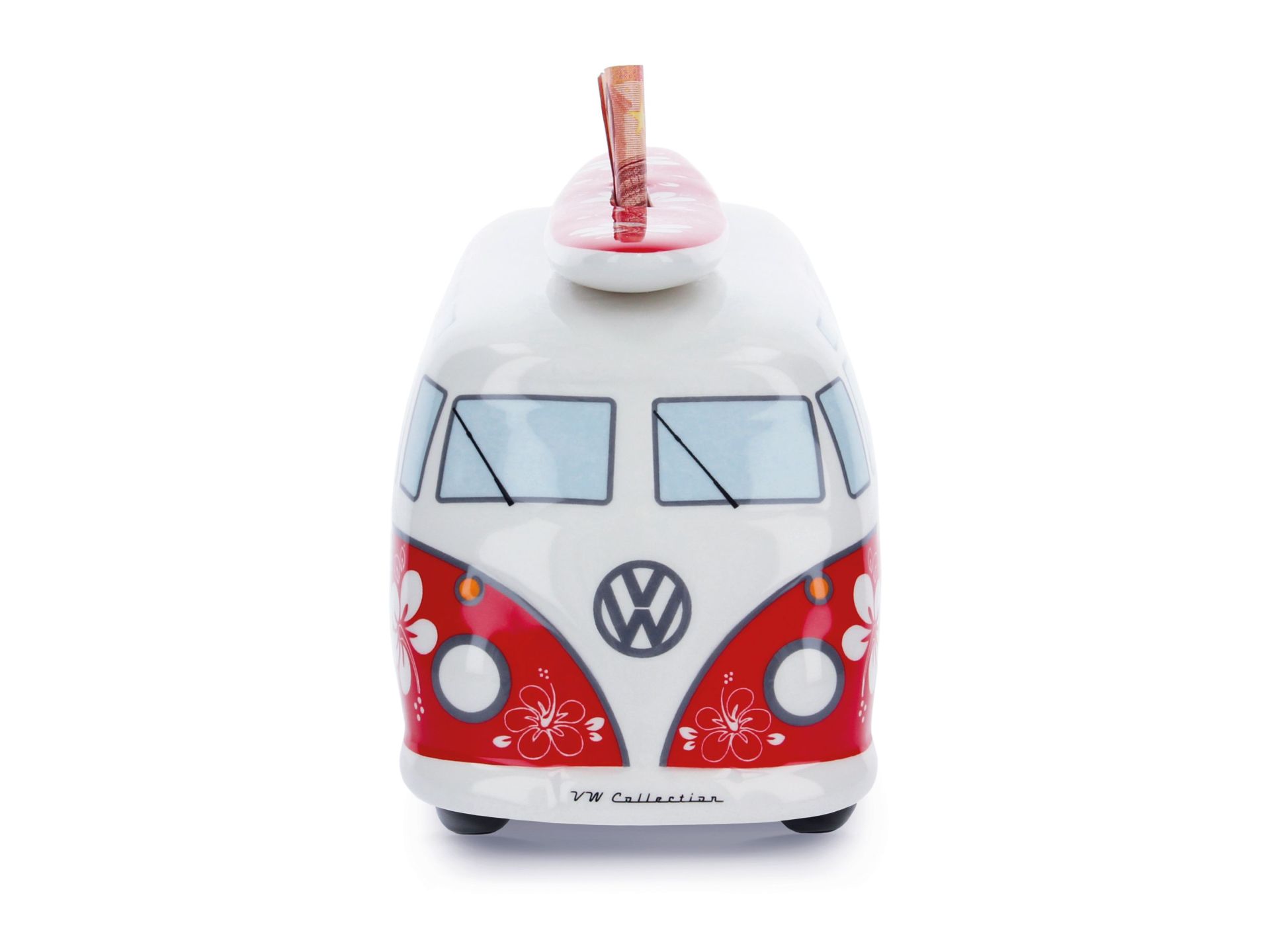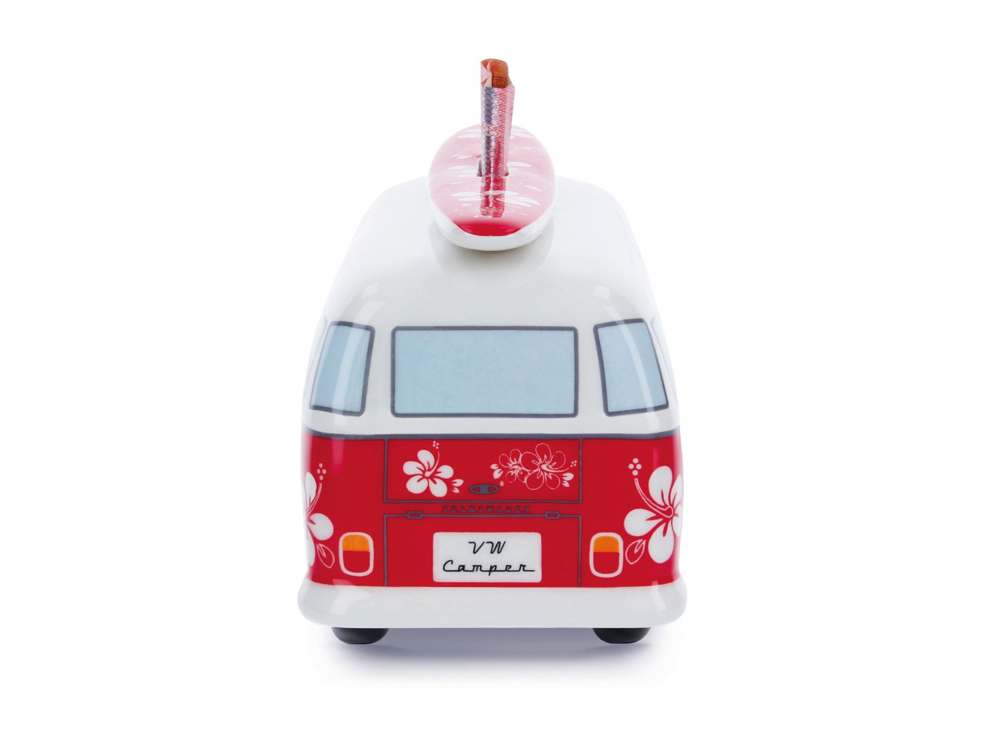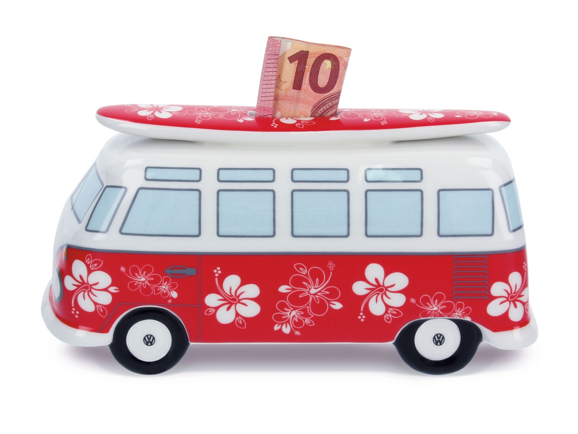 Original VW Bulli T1 Bus Spardose mit Surfbrett (1:18) rot, flower power