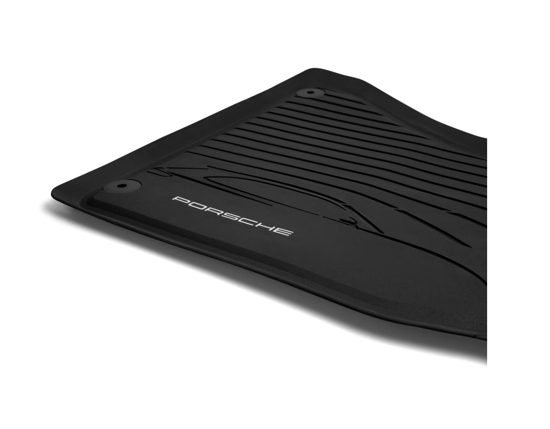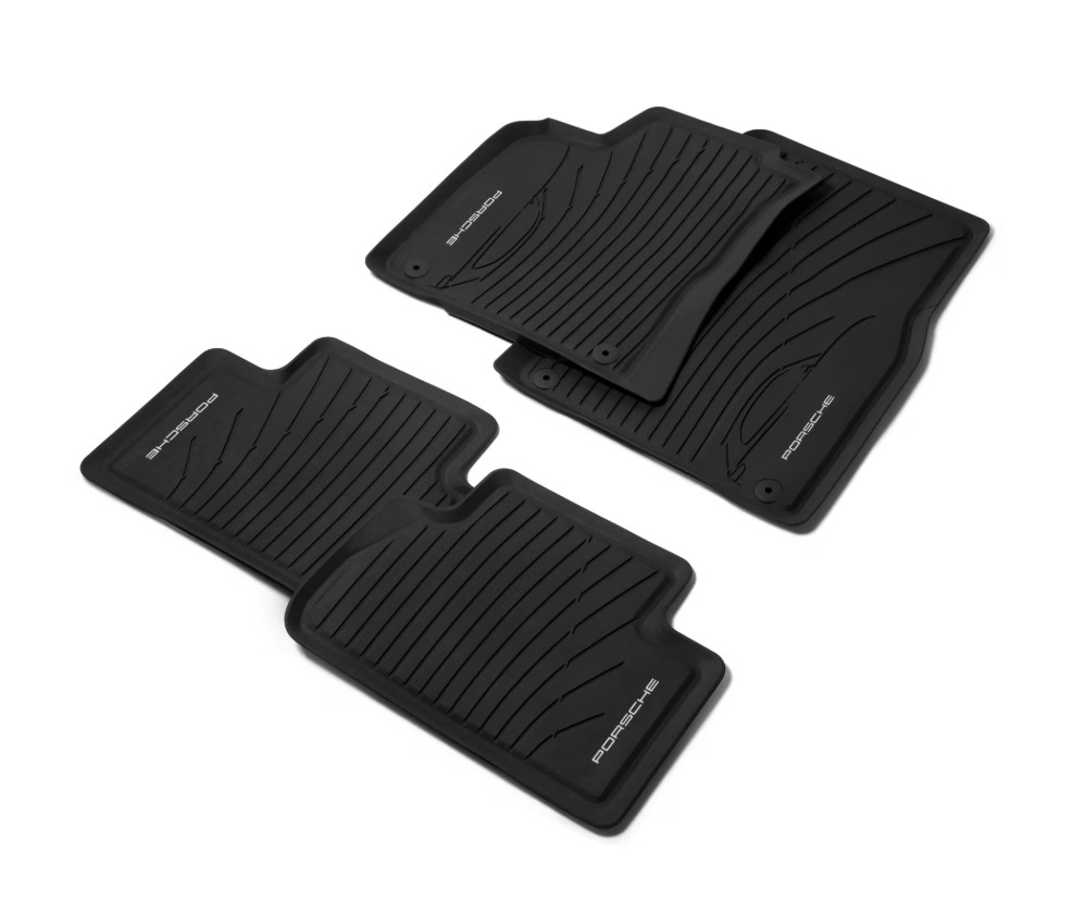 Vierteiliger Satz in Interieurfarbe ansprechendem Design mit Fahrzeugsilhouette und „PORSCHE“ Schriftzug. Verrutschsicher und wasserundurchlässig. Mit hochgezogenem, umlaufendem Rand.